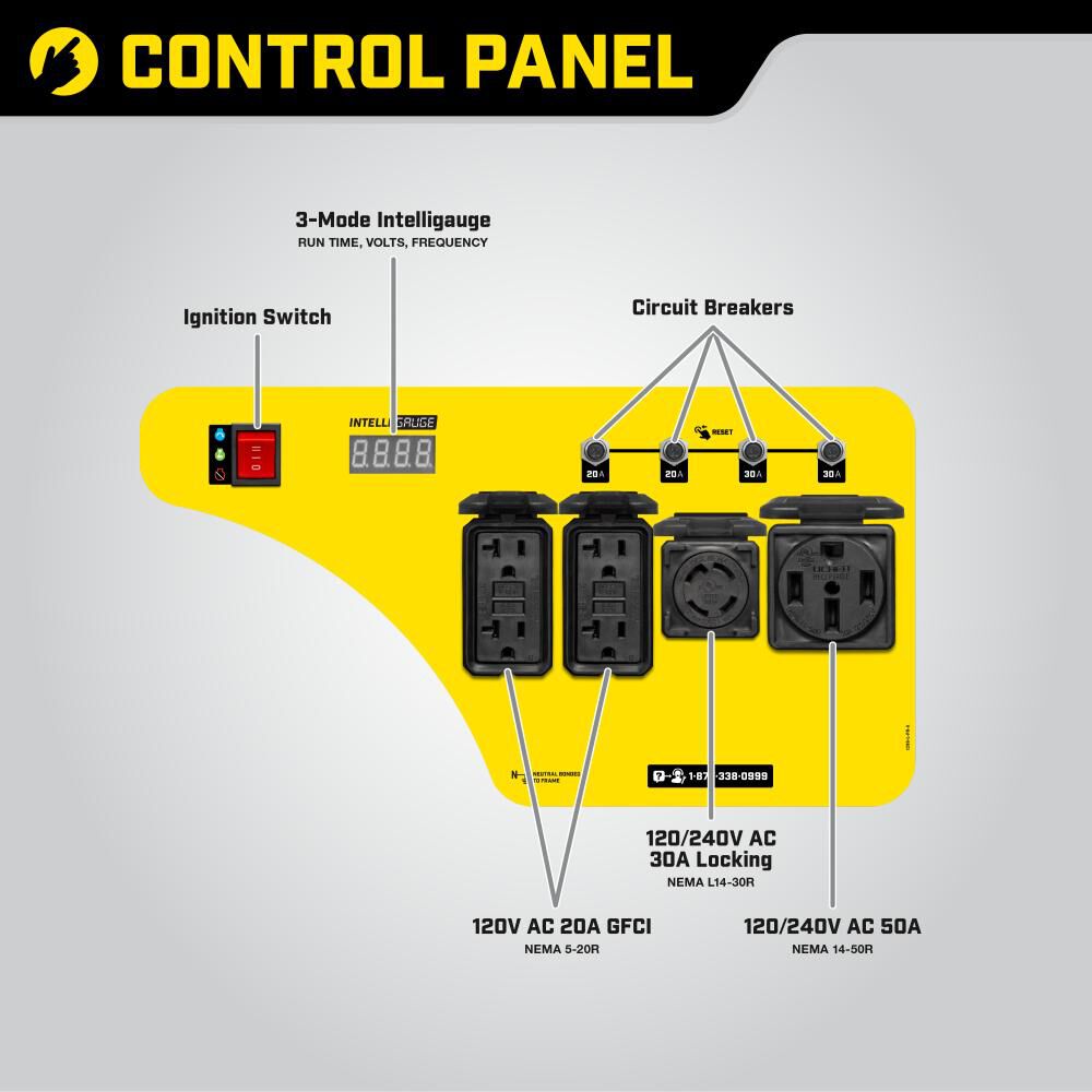 - Four 120V 20A GFCI outlets, a120/240V 30A locking outlet and a 120/240V 50A outlet (14-50R), plus Volt Guard‚Ñ¢ built-in surge protector prevents overloads and keeps your equipment safe