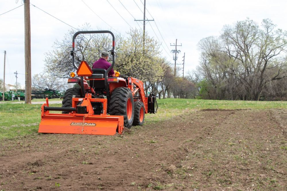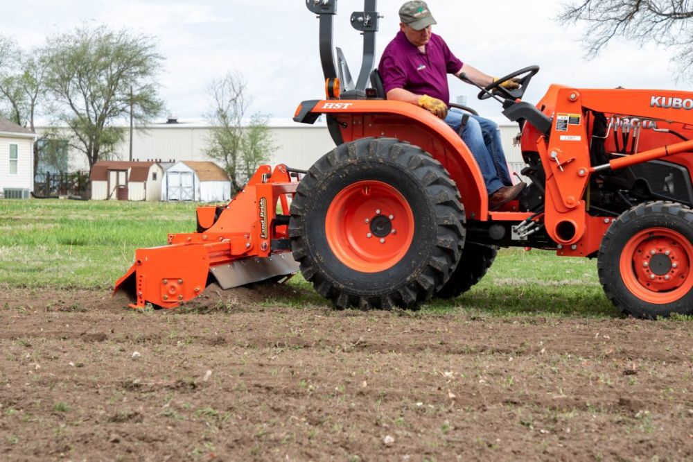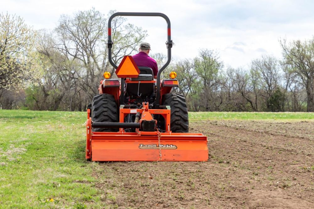 The Land Pride RTR12 reverse-till rotary tillers turn the soil to prepare a seedbed for gardening or lawn seeding.