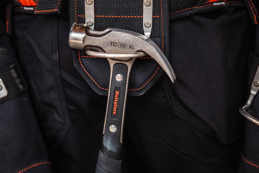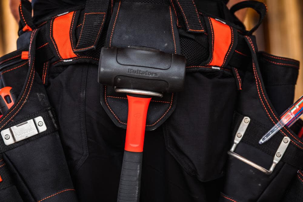 - Includes two large sleeves for a pry bar and combination square, two steel loop hammer holders, one steel tape clip, and a zippered pocket to secure valuables