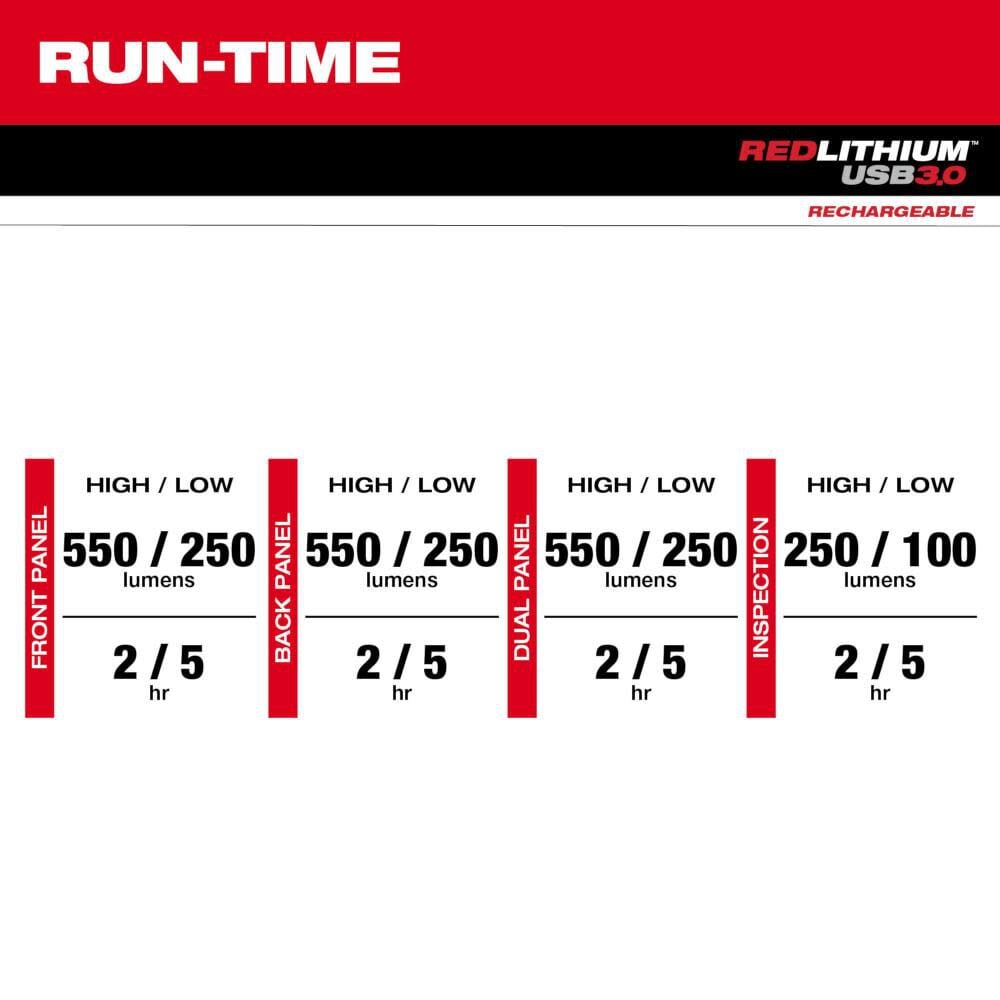The REDLITHIUM USB Stick Light w/ Magnet has 550 lumens of TRUEVIEW High-Definition output and 2 hours of run-time on HIGH, with 2 brightness options to manage output and run-time.