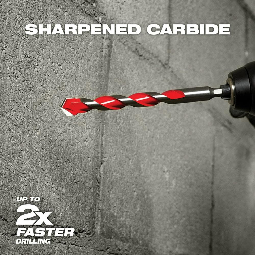 The MILWAUKEEÆ 9/16" x 4" x 6" Carbide Hammer Drill Bit uses sharpened carbide to deliver up to 5x longer life in concrete and up to 2x faster drilling into masonry material.