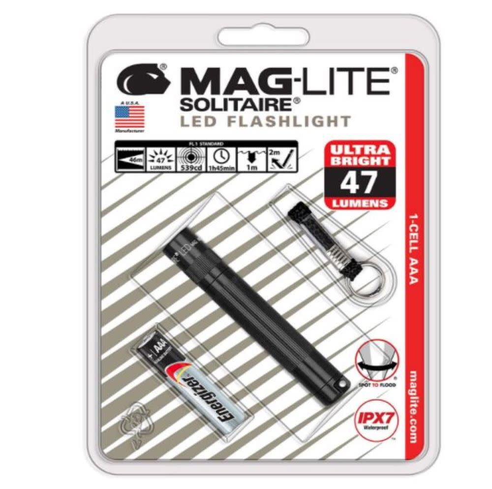 Package Contents - 1 Maglite solitaire 1-cell AAA flashlight, 1 key lead, and 1 AAA cell premium alkaline battery