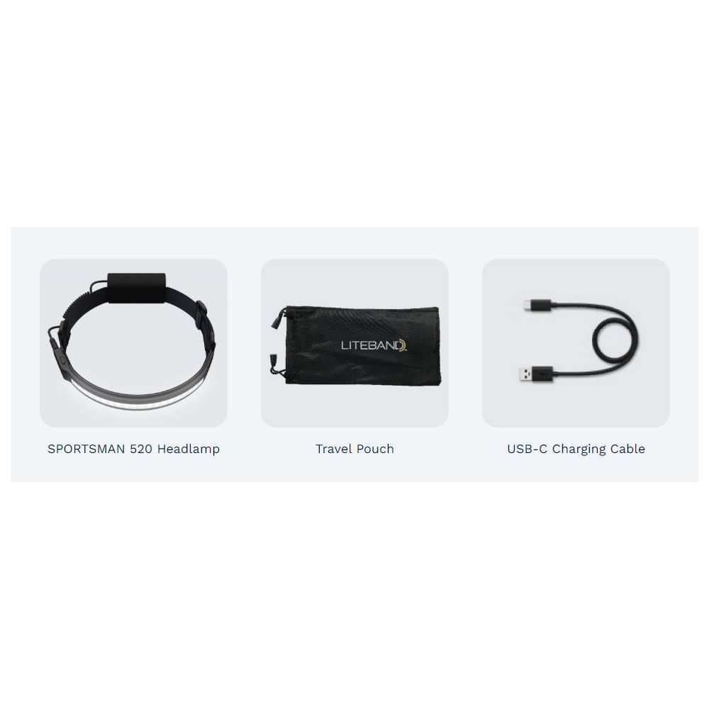 Package Contents - Sportsman 520 Headlamp, Travel Pouch, USB-C Charging Cable