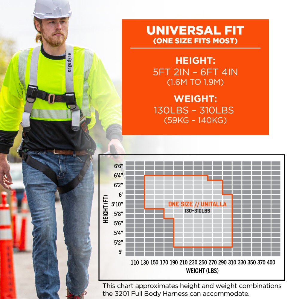 - User Weight Capacity - 130 to 310 Lbs/ 59 to 140 kg (including all clothing, tools and equipment)