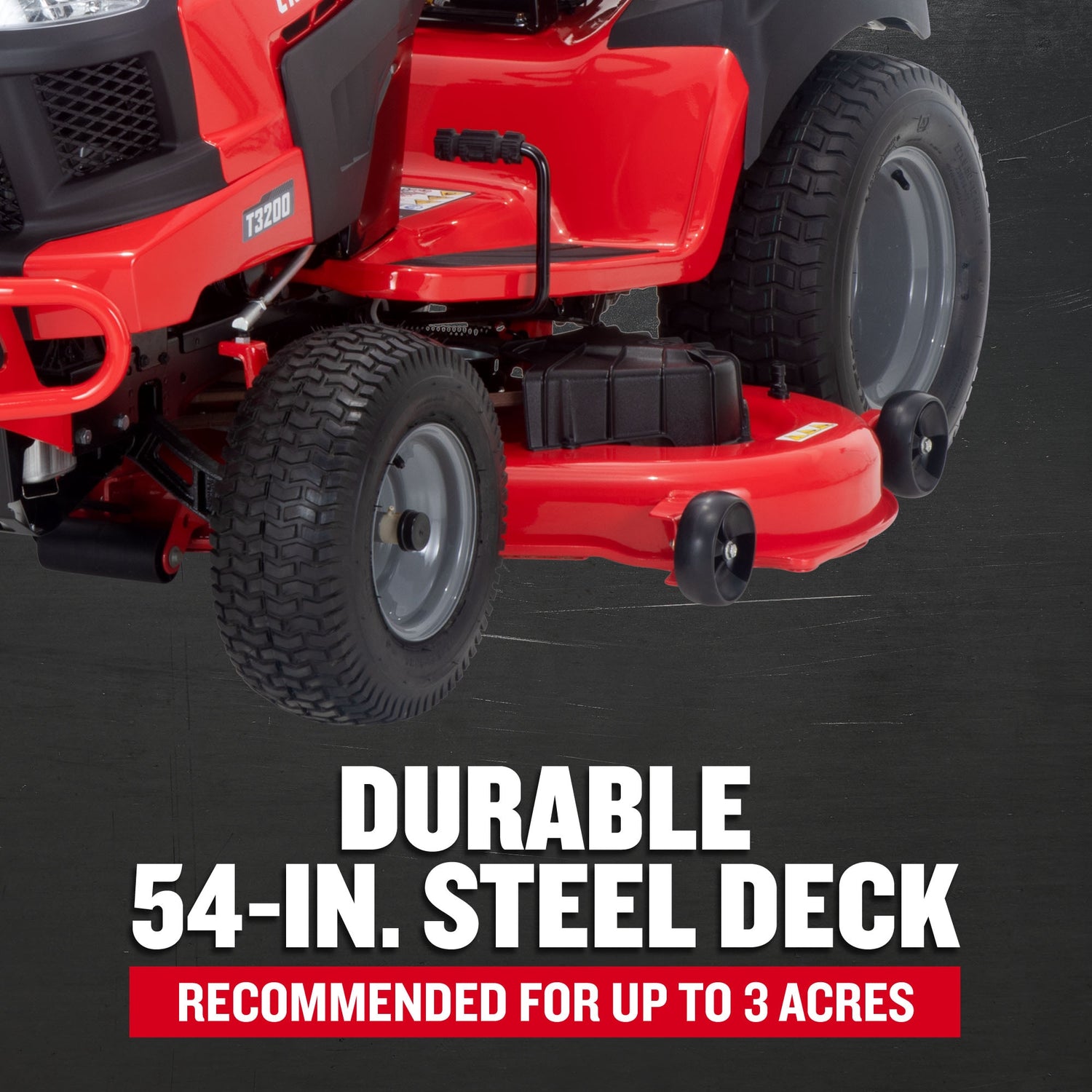 DURABLE: 54-in stamped steel deck cuts up to 3 acres that is also equipped with "s" blade for optimal cuts and easy replacement