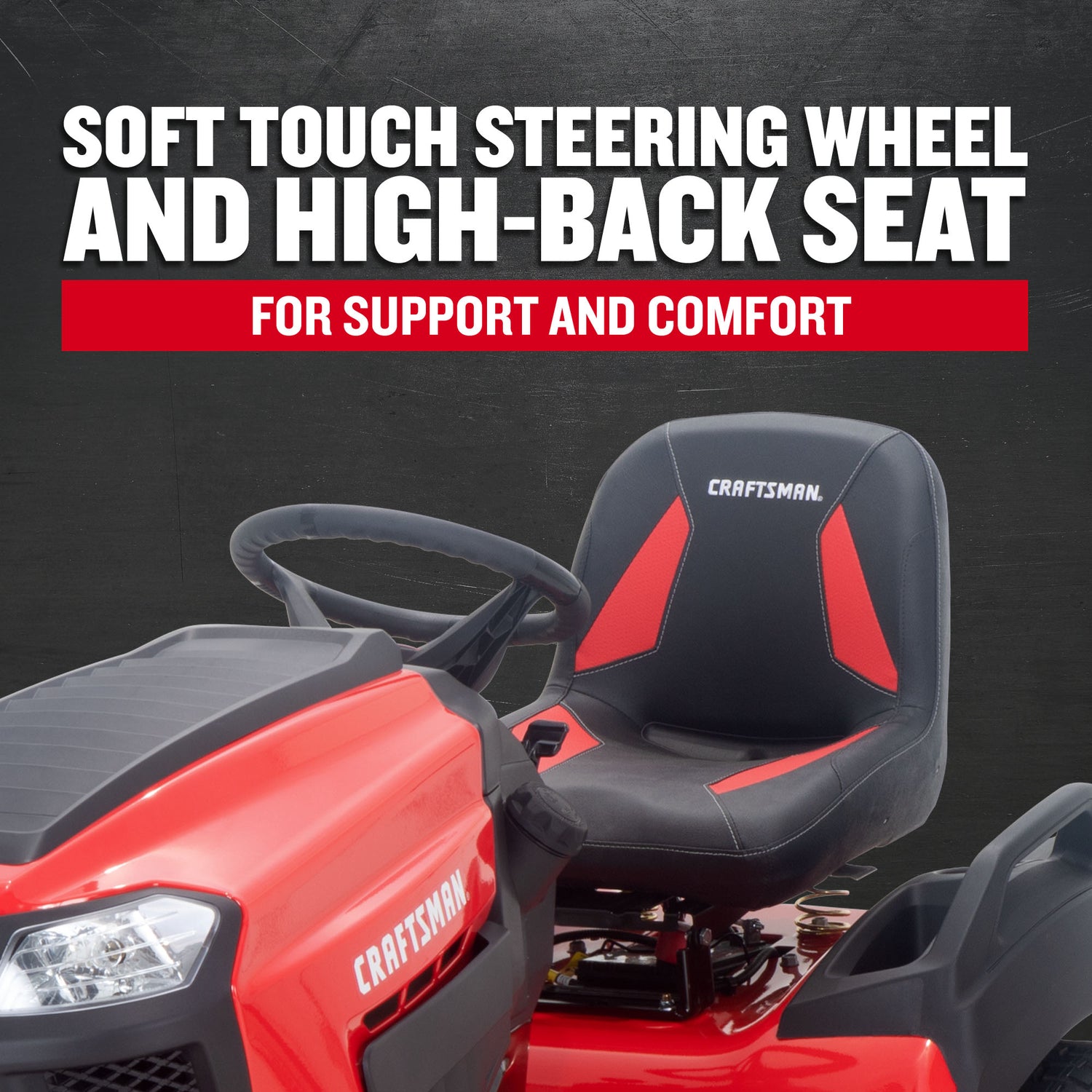 The hydrostatic transmission with foot pedal control, soft-touch steering wheel, and cut and sew, high-back seating for support and comfort will provide a precise ride as it glides through turns with a 5-in.