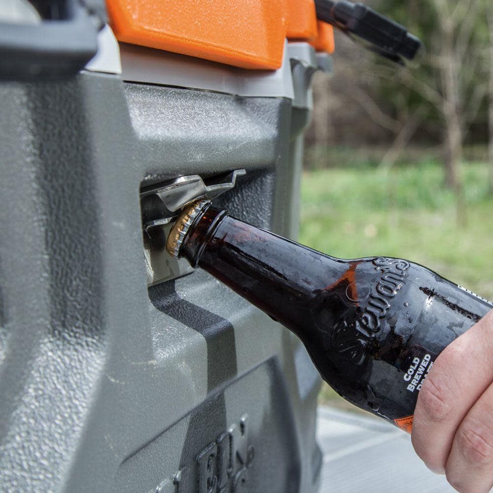 - Stainless steel bottle opener on exterior of cooler