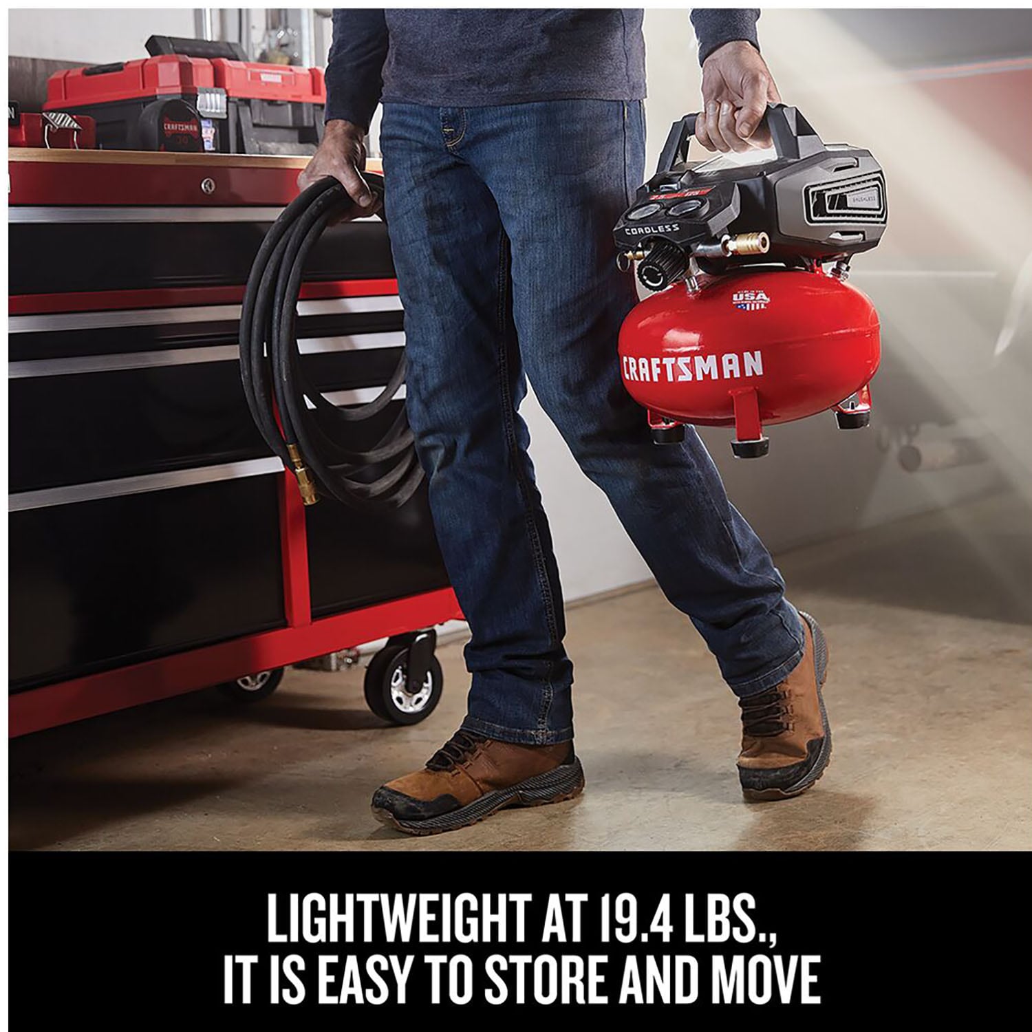 The V20 2.5 Gallon Brushless Cordless Air Compressor offers all the cordless benefits while allowing you to continue using the pneumatic tools you already own.