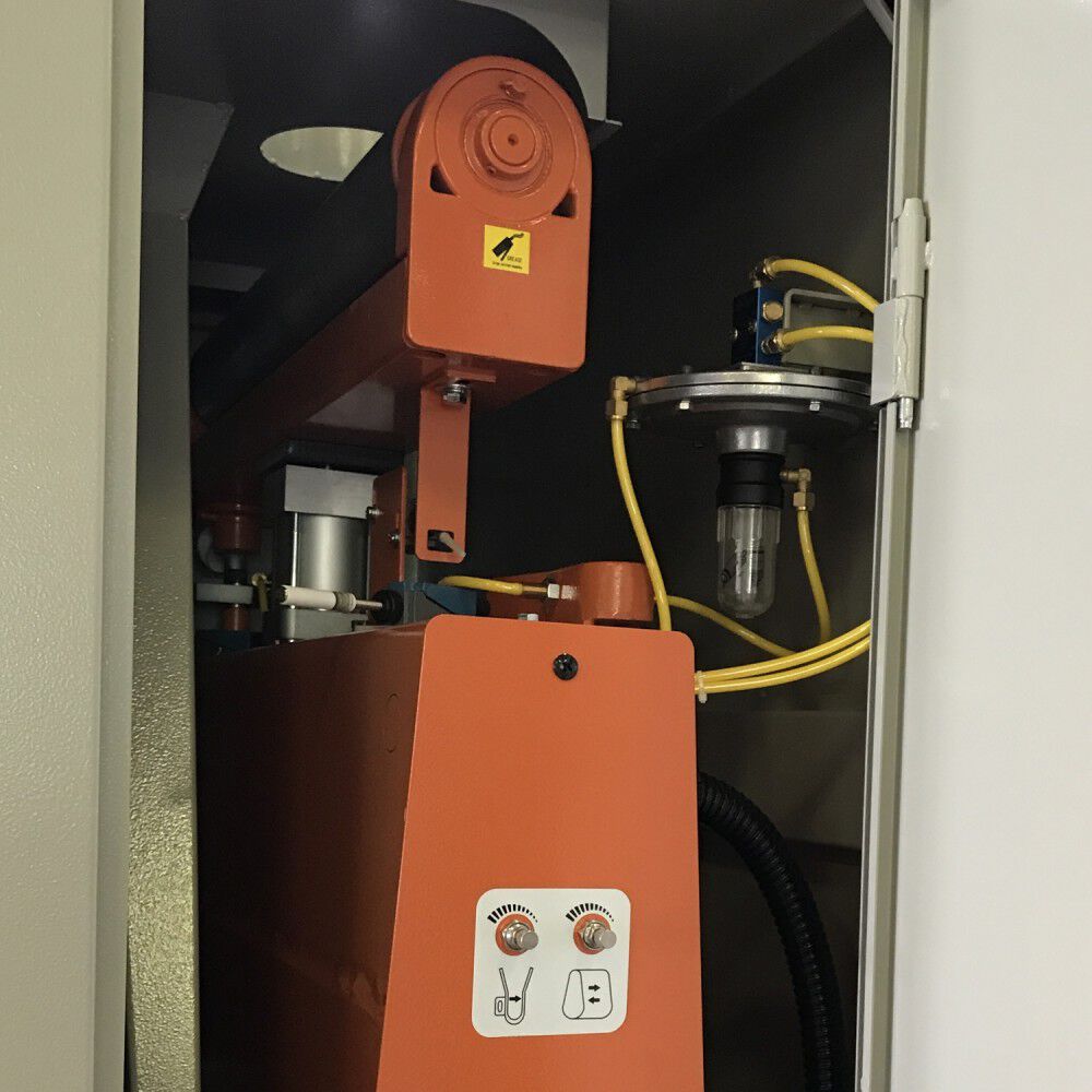 - Pneumatic belt tension controls are accessible from both sides of the machine