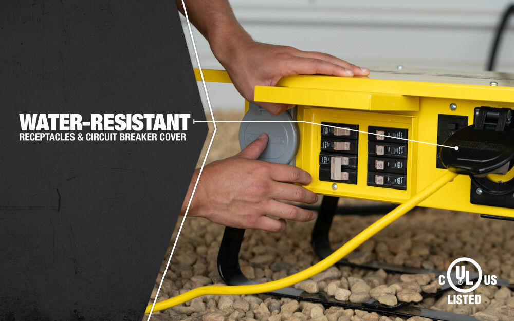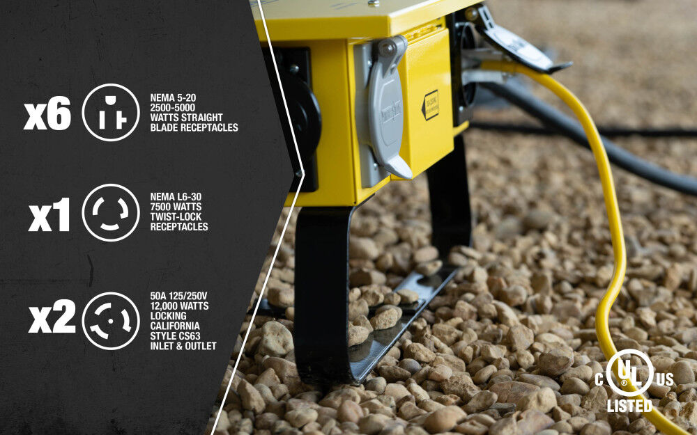 The Extreme Box has six GFCI protected NEMA 5-20R straight blade receptacles and one, NEMA L6-30, 250V, 30A locking outlet.