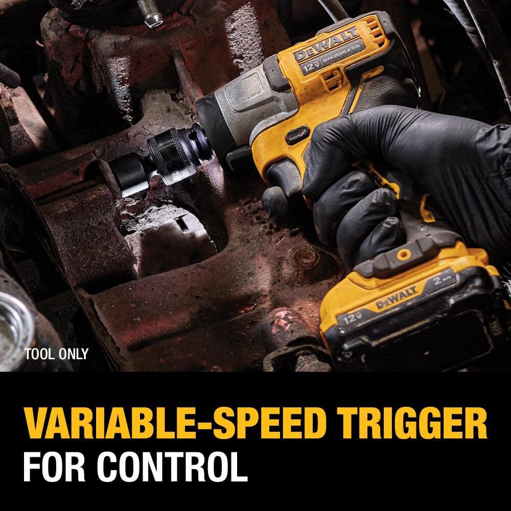 - Includes DCF902B 12V MAX Brushless 3/8-in impact wrench, two DCB122 12V MAX batteries with state of charge indicator, DCB112 12V and 20V MAX charger, belt clip and a kit bag